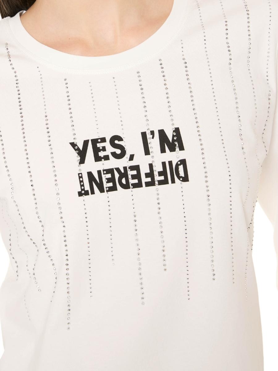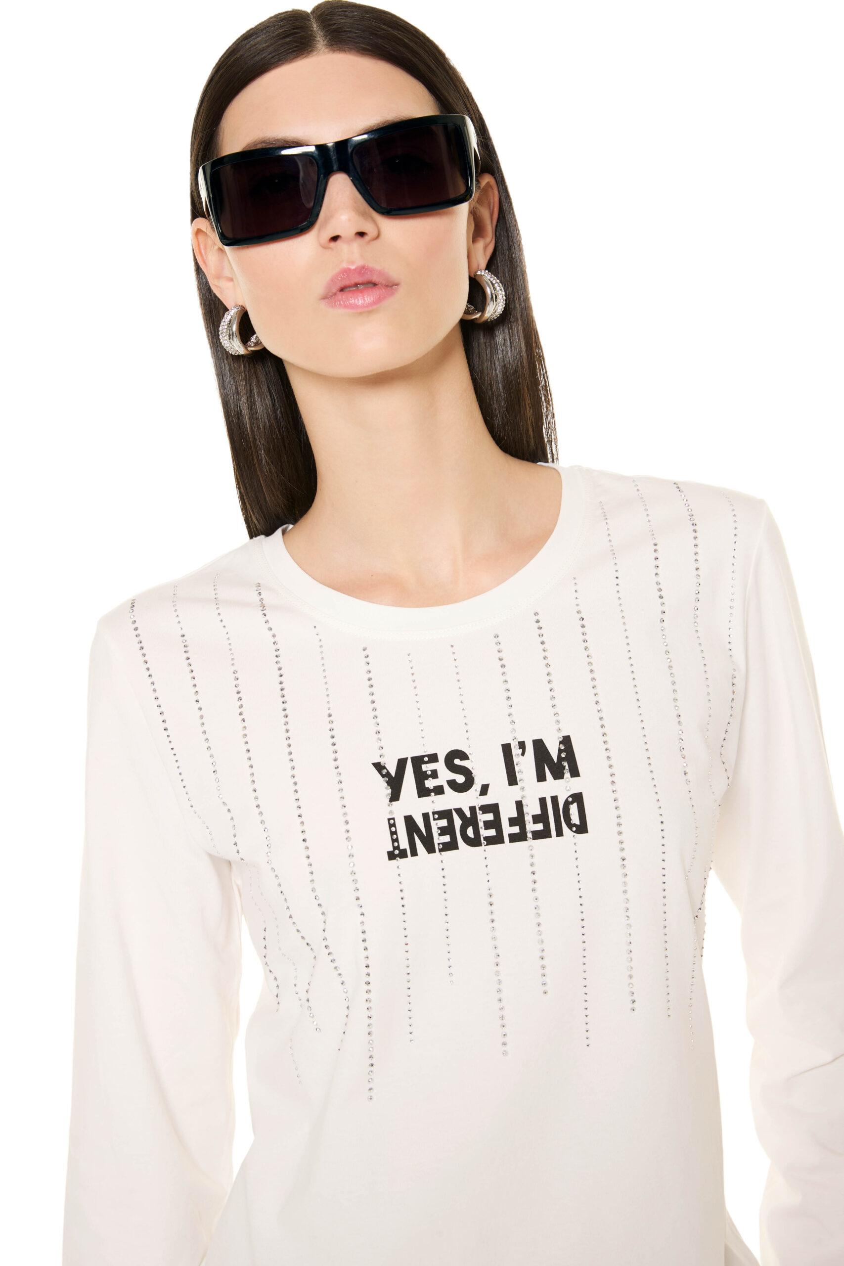 Maglia manica lunga in cotone con stampa frontale “yes, i’m different” e applicazione di strass