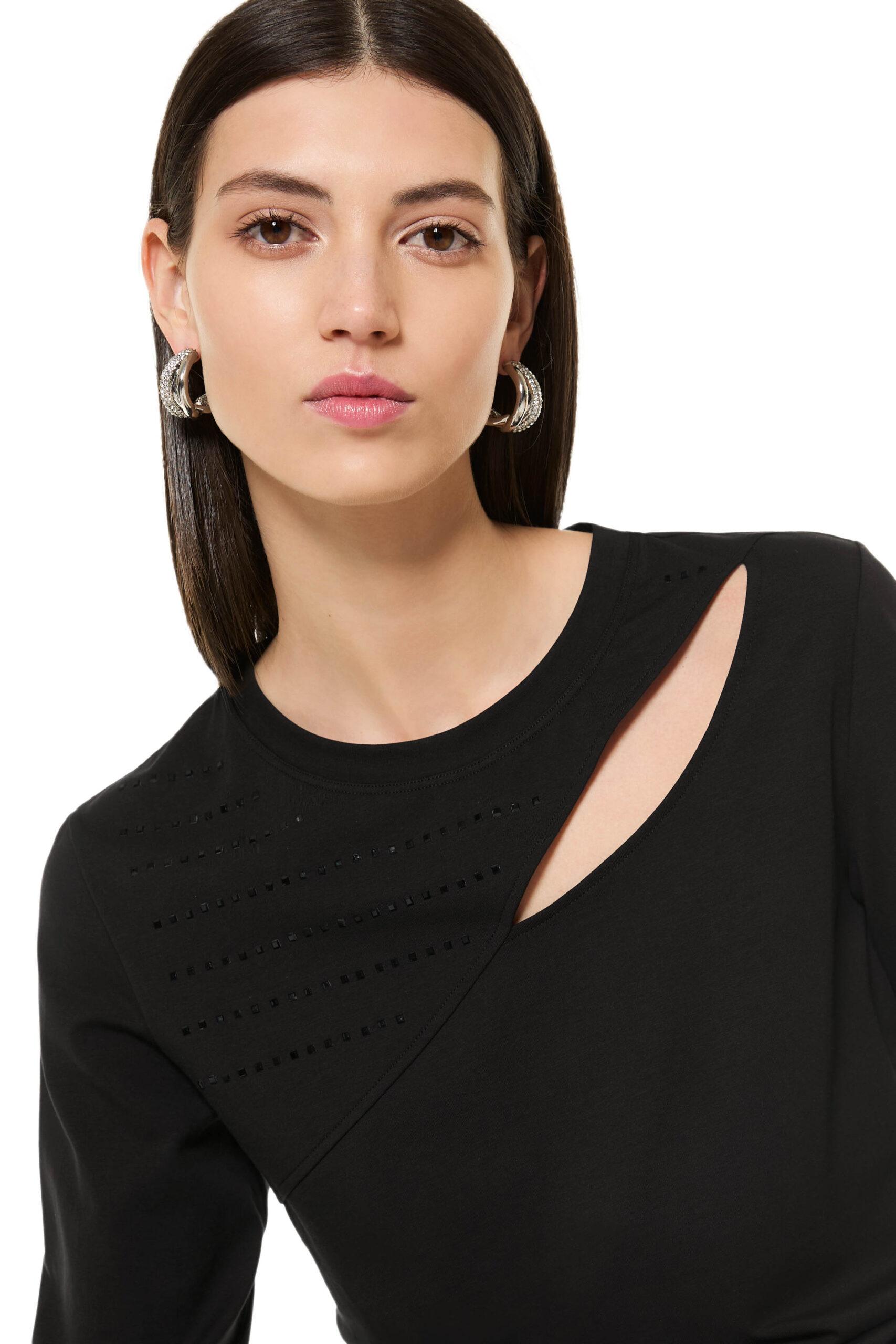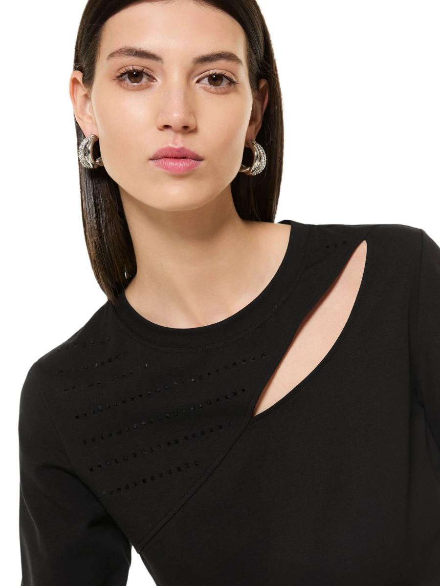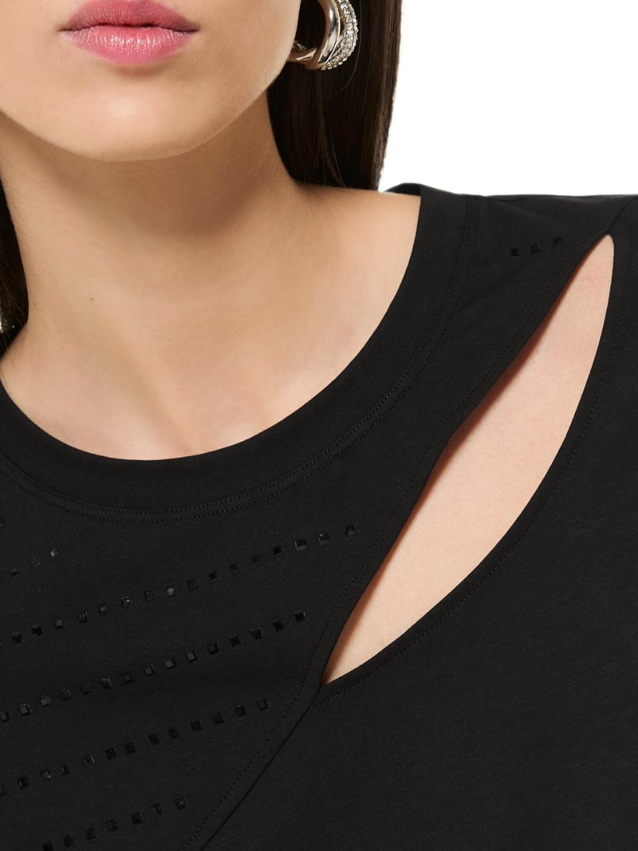 Con dettaglio di cut-out frontale arricchito da strass tono su tono, in colore nero