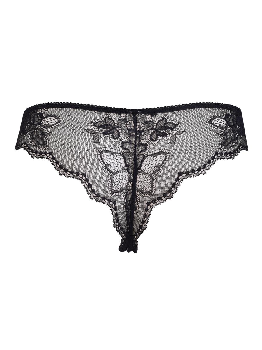 Brasiliana liscia davanti in morbida microfibra semilucida e in pizzo nella parte posteriore, con tassello igienico 100% cotone. Prezioso pizzo a frastaglio, con trama floreale, morbido sulla pelle grazie alla sua texture piatta e leggera.