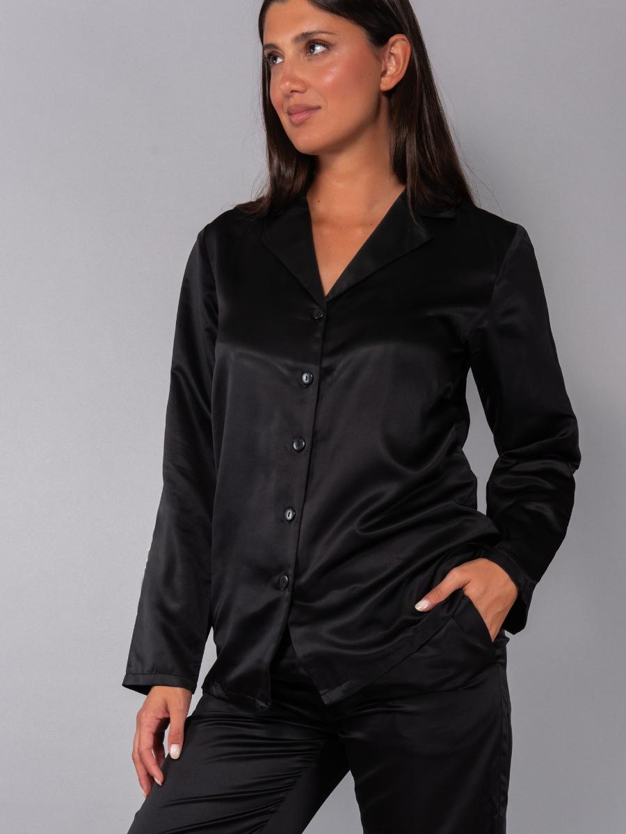 Composto da maglia aperta modello camicia con colletto e bottoni, e pantalone diritto con comodo elastico in vita e pratiche tasche laterali
