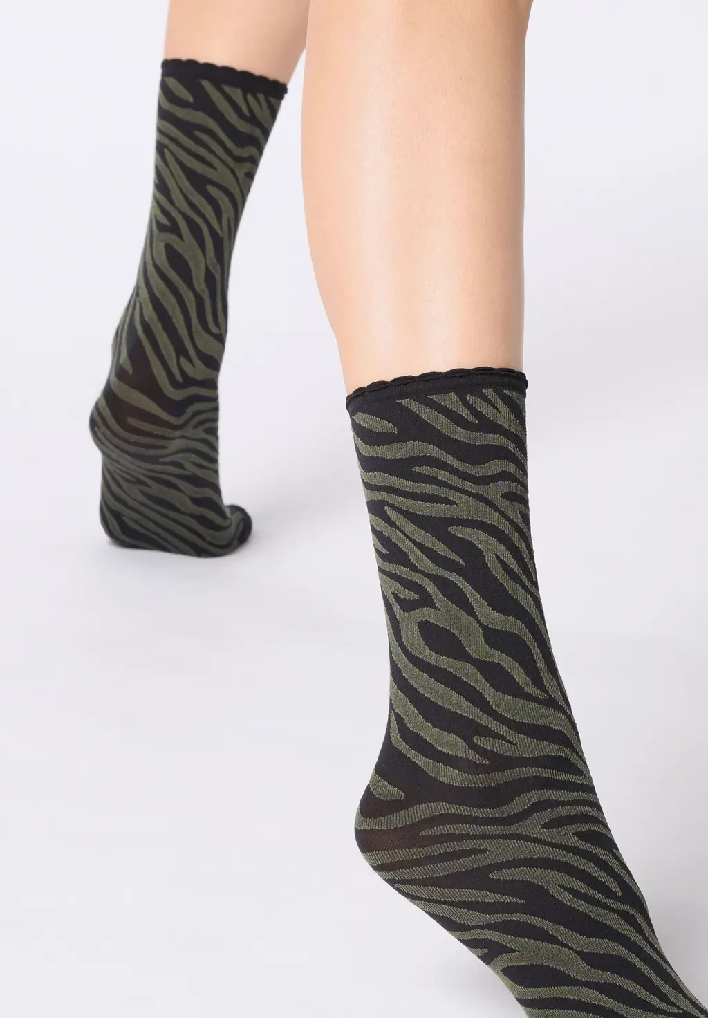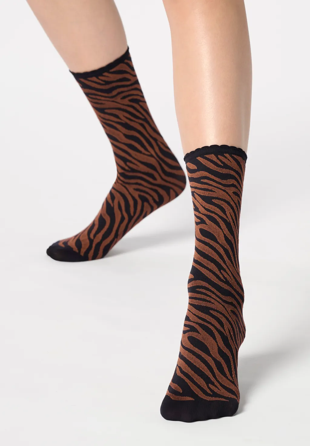 Calzino coprente Oroblù 50 denari, con motivo animalier. Perfetto per aggiungere un tocco grintoso e di tendenza al tuo look.