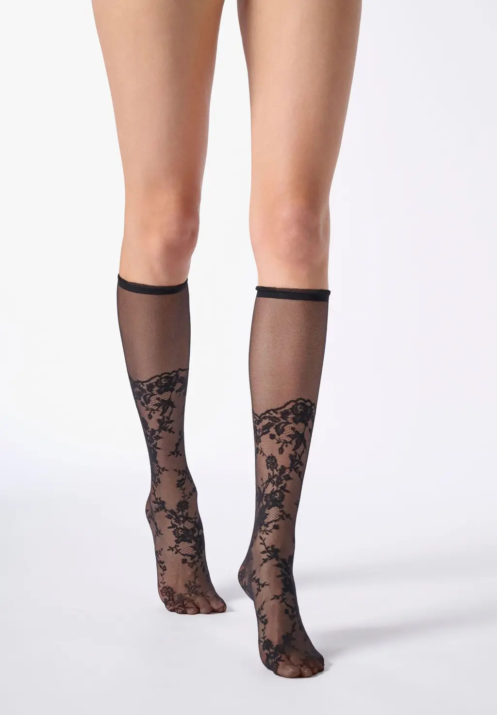 Gambaletto velato Oroblù 20 denari, effetto pizzo e motivo floreale, l’ideale per chi cerca eleganza e raffinatezza.