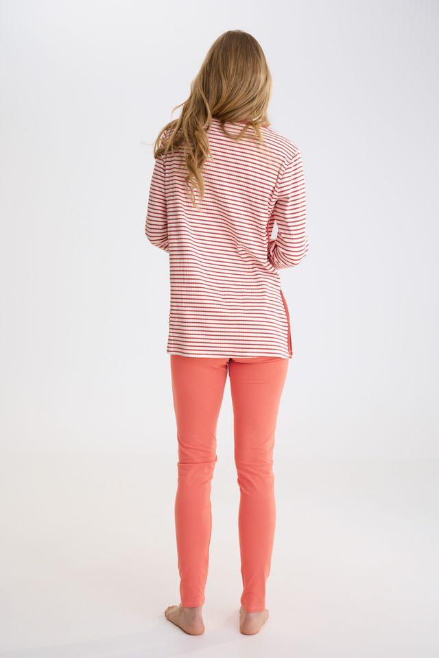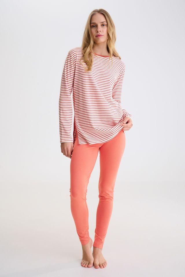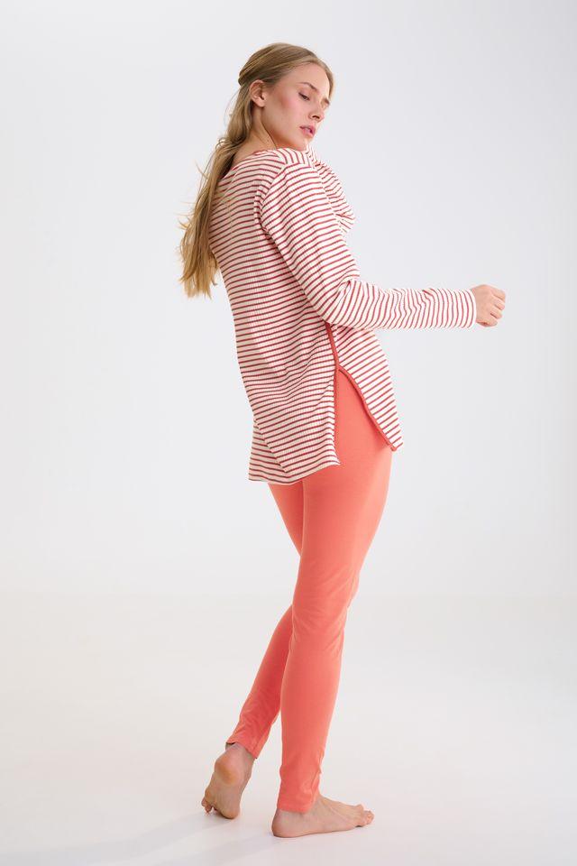 Motivo a costina impreziosito da una fantasia di righe orizzontali arancio mattone.
