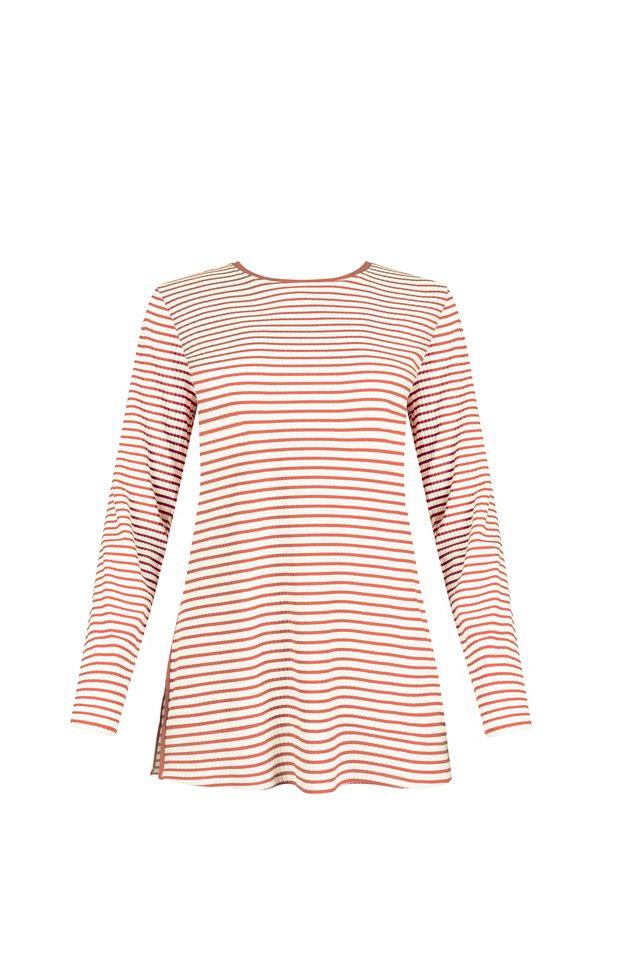 Maglia girocollo con manica lunga e dalla vestibilità lunga e svasata, dotata di spacchetto sul lato destro.