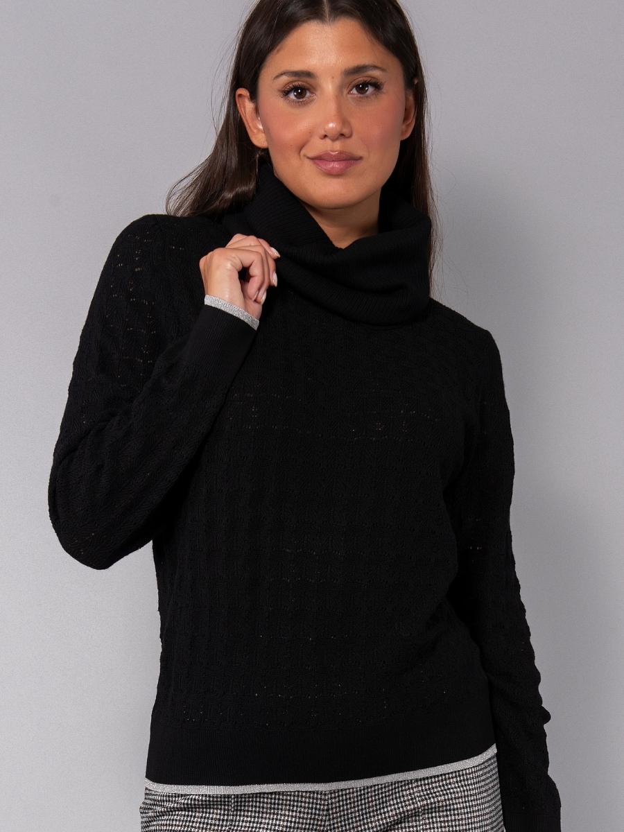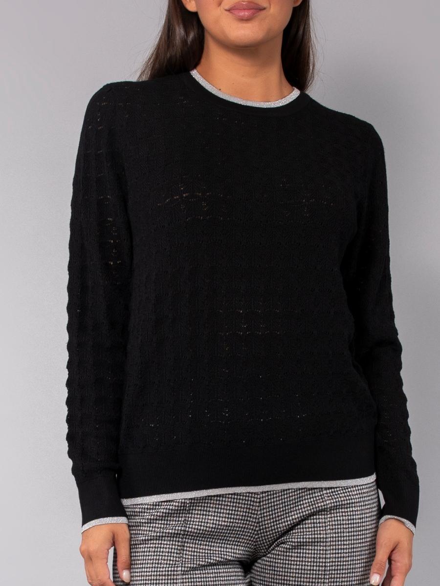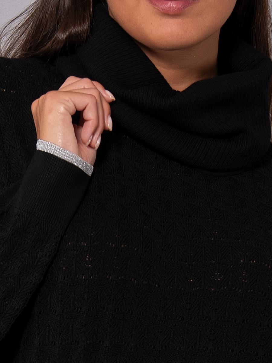 Dettaglio di bordo in lurex argento sul girocollo, sui polsini e sul fondo della maglia