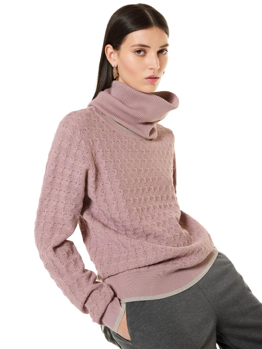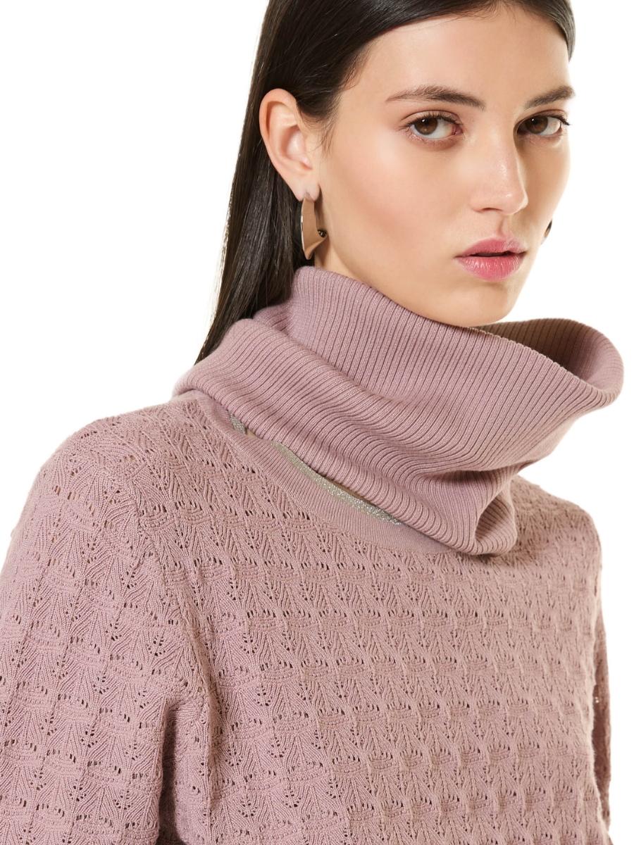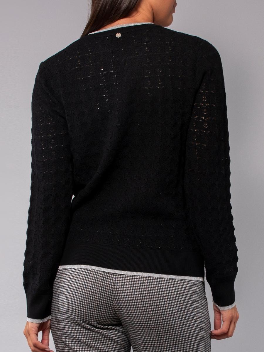 Dettaglio di bordo in lurex argento sul girocollo, sui polsini e sul fondo della maglia