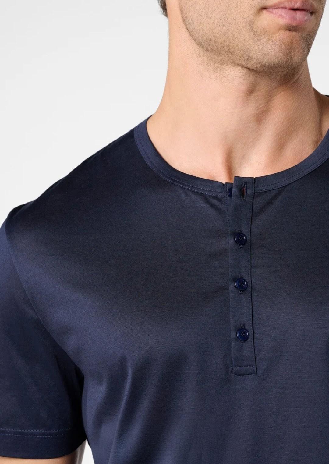 • Maglia manica corta con scollo serafino, tinta unita blu, realizzata in 100% cotone mercerizzato. Tessuto fresco e leggero, perfetto per la stagione più calda.